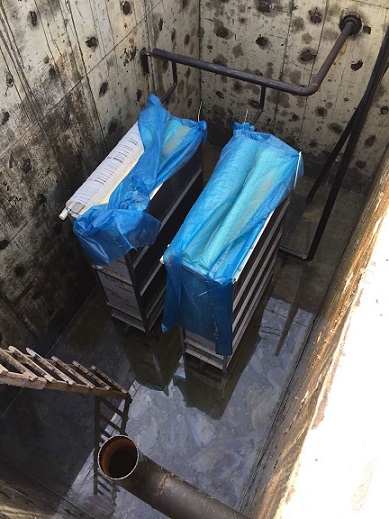 6.安裝膜支架時(shí)需做好膜支架、曝氣管的水平安裝,由于平板膜是干式膜片,平板 MBR 組件開(kāi)始調(diào)試時(shí),先使用清水浸泡膜30分鐘,再進(jìn)行調(diào)試。
